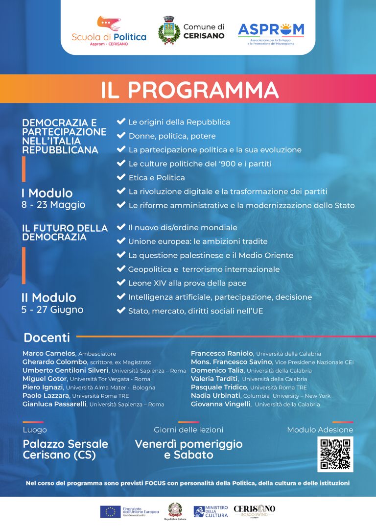 Un percorso gratuito di alta formazione politica promosso dal Comune di Cerisano in collaborazione con ASPROM, all’interno di un progetto finanziato dall’Unione Europea.